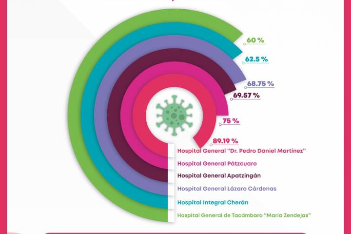 La Secretaría de Salud de Michoacán (SSM), informa que la ocupación de camas para la atención de Infecciones Respiratorias Agudas Graves (IRAG), en 6 hospitales de la institución es del 89.19 a 60 puntos porcentuales. El Hospital General de Uruapan "Pedro Daniel Martínez" es el que mayor prevalencia registra con 89.19 por ciento, seguido de Pátzcuaro, con 75; Apatzingán 69.57; Lázaro Cárdenas con 68.75; Cherán 62.5 y Tacámbaro con ...
