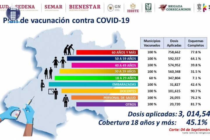 En Michoacán, a través del Plan Nacional de Vacunación, se han aplicado 3 millones 14 mil 540 dosis de vacuna anti COVID-19. Con lo anterior se alcanzó una cobertura del 45.1 por ciento al corte del 4 de septiembre, mientras que las jornadas de inmunización de diversos grupos etarios continúa. A los adultos mayores de 60 años se han aplicado 758 mil 662 dosis; de 50 a 59, 592 mil 557 dosis; de 40 a 49 años, 574 mil 952 dosis; de 30...