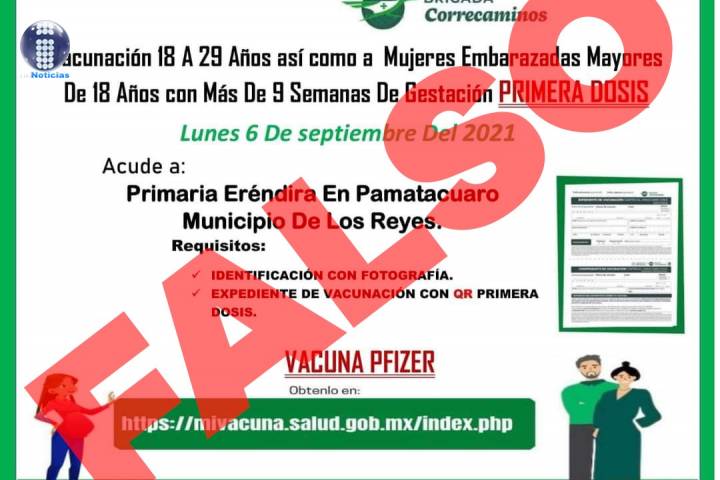 La Secretaría de Salud de Michoacán (SSM), informa que la información que circula sobre una supuesta jornada de vacunación anti COVID-19 en Los Reyes a la población de 18 a 29 años y embarazadas, es falsa. Por lo anterior, se exhorta a las y los michoacanos a atender solo información oficial al respecto y evitar movilización innecesaria. A través de la Brigada Correcaminos en coordinación con autoridades de los tres niveles de g...