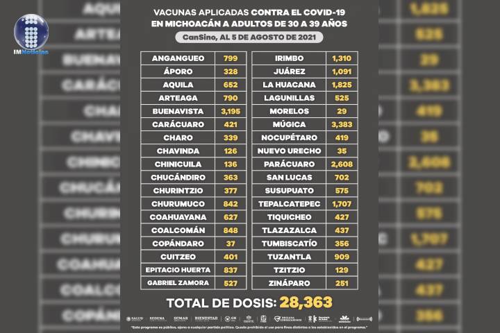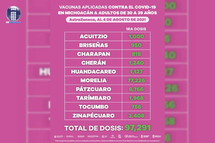 La población de 30 a 39 años ha recibido en total 313 mil 766 dosis de vacuna contra el COVID-19 en la entidad, informó la Secretaría de Salud de Michoacán (SSM). Aun con esquemas completos de vacunación, se reitera el exhorto a las y los michoacanos a no bajar la guardia, usar de forma permanente el cubrebocas al estar en contacto con otras personas, sobre todo en espacios cerrados. También se deben evitar aglomeraciones, no saludar...