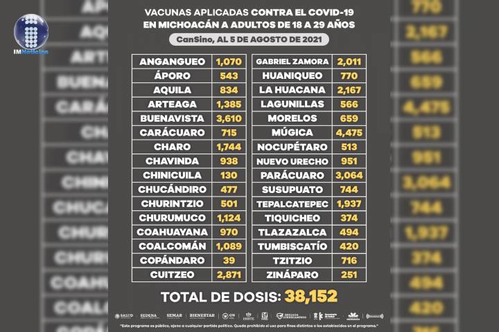 La vacunación contra COVID-19 a población de 18 a 29 años, se lleva a cabo hoy en los municipios de Angangueo, Cojumatlán, Marcos Castellanos, Numarán y Tiquicheo. Personal médico, paramédico y de enfermería de la Secretaría de Salud de Michoacán (SSM), ha participado en la aplicación de 38 mil 152 dosis en 32 municipios de la entidad. La vacuna ayuda a evitar complicaciones en caso de contraer el virus, por ello, la SSM reitera...