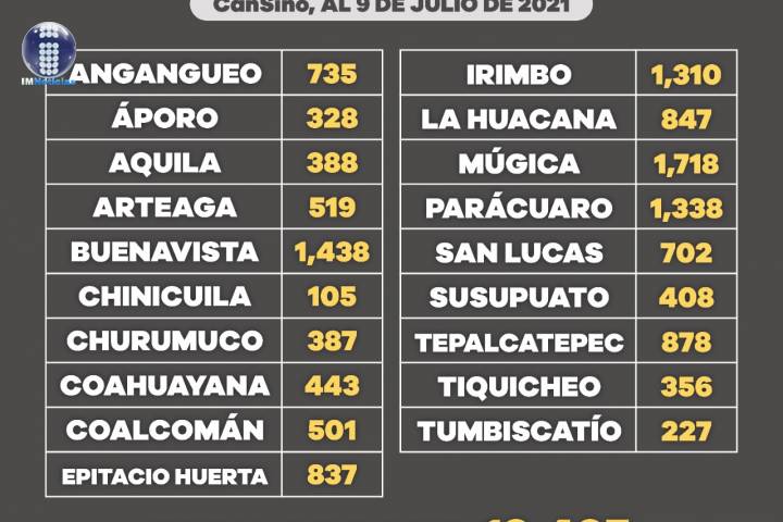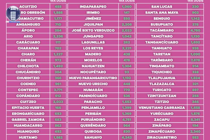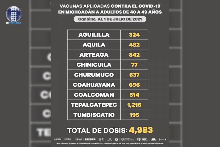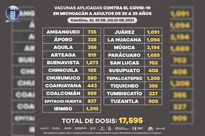 Avanza con éxito la jornada de inmunización anti COVID-19, para las y los michoacanos de 30 a 39 años de edad, donde hasta el momento se han aplicado 17 mil 595 dosis. Las dosis aplicadas han sido para habitantes de los municipios de Angangueo, Áporo, Aquila, Arteaga, Buenavista, Chinicuila, Churumuco, Coahuayana, Coalcomán, Epitacio Huerta e Irimbo. Así como Juárez, La Huacana, Múgica, Parácuaro, San Lucas, Susupuato, Tepalcatep...
