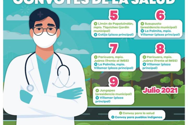 La Secretaría de Salud de Michoacán (SSM), informa a la población sobre los lugares en los que se encontrarán los Convoyes de Salud y para Pueblos Indígenas, del 5 al 9 de julio. El Convoy de la Salud se instalará en la comunidad de El Limón de Papatzindán, municipio de Tiquicheo (5), Susupuato (6), Parícuaro, municipio de Juárez (7-8) y Junganpeo (9). Mientas que la unidad móvil para Pueblos Indígenas, estará en la plaza pr...