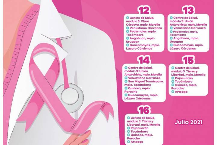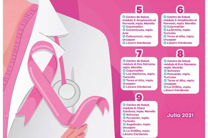 Las unidades móviles para la detección oportuna del cáncer de mama, de la Secretaría de Salud de Michoacán (SSM), se encontrarán brindando atención gratuita a mujeres de 40 a 69 años, del 5 al 9 de julio, en los siguientes municipios: Morelia, Cojumatlán, Ario, Uruapan, Lázaro Cárdenas, Turicato Y Sahuayo. Todas las interesadas en recibir el servicio, deberán presentarse con su credencial de elector y/o CURP, axilas depiladas, no u...