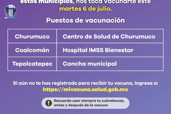 Este martes 6 de julio se reactiva la jornada de vacunación contra COVID-19, por lo que la Secretaría de Salud de Michoacán (SSM), invita a personas de 30 a 39 y 40 a 49 años a acudir al módulo que les corresponda. En Churumuco, Coalcomán y Tepalcatepec, se estará inmunizando a población de 30 a 39 años de edad; en Buenavista, La Huacana, Múgica y Parácuaro a los grupos de 30 a 39 y 40 a 49 años. En Álvaro Obregón, Angamacutir...