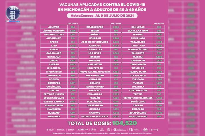 En la entidad se han aplicado 242 mil 256 dosis de la vacuna anti-COVID-19 a personas de entre 40 y 49 años de edad, informó la Secretaría de Salud de Michoacán (SSM). De las dosis aplicadas, 67 mil 314 fueron de AstraZeneca, 149 mil 357 de Pfizer, 4 mil 983 de CanSino y 20 mil 602 de Sinovac. La SSM reitera el exhorto a la población que ya fue inmunizada a no bajar la guardia en la implementación de medidas sanitarias para el cuidado...