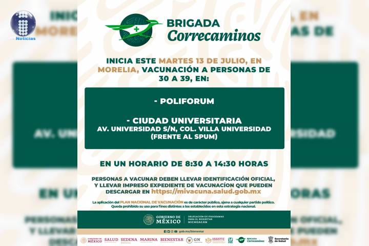 Este martes 13 de julio iniciará la vacunación de las primeras dosis de Oxford-AstraZeneca contra COVID-19 a personas de 30 a 39 años de edad y mujeres embarazadas mayores de 18 años, en Morelia. En coordinación con las autoridades del sector salud, Secretaría de Salud de Michoacán (SSM), Instituto Mexicano del Seguro Social (IMSS) e Instituto de Seguridad y Servicios Sociales de los Trabajadores del Estado (ISSSTE), Secretaría de la ...