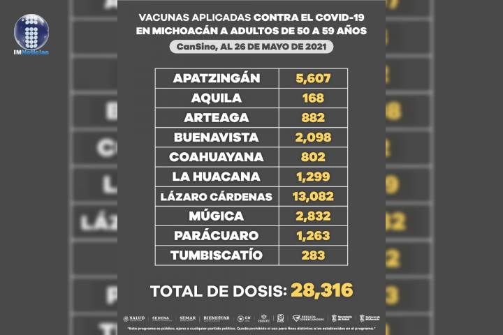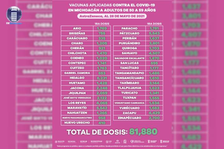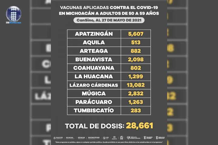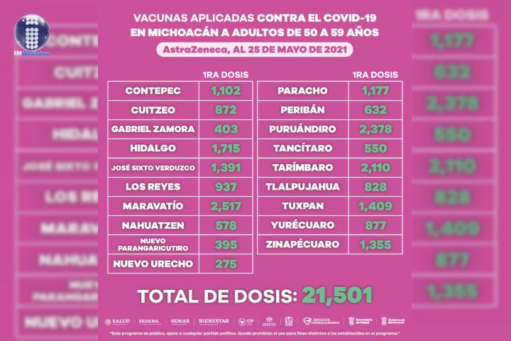 NOTICIAS 25/05/2021Vacunados 169 mil 901 michoacanos de 50 a 59 años contra COVID-19 Hasta el día de hoy se han aplicado 169 mil 901 dosis de vacuna anti COVID-19, dirigida a población de 50 a 59 años, de las farmacéuticas CanSino, Pfizer y AstraZeneca, en beneficio de 34 municipios.
