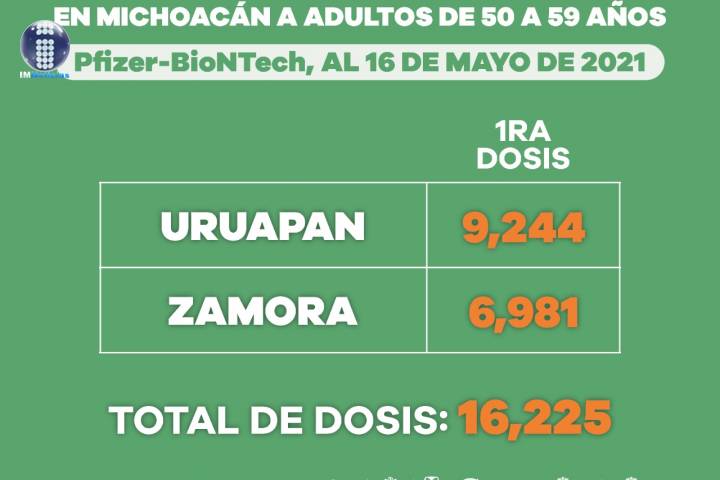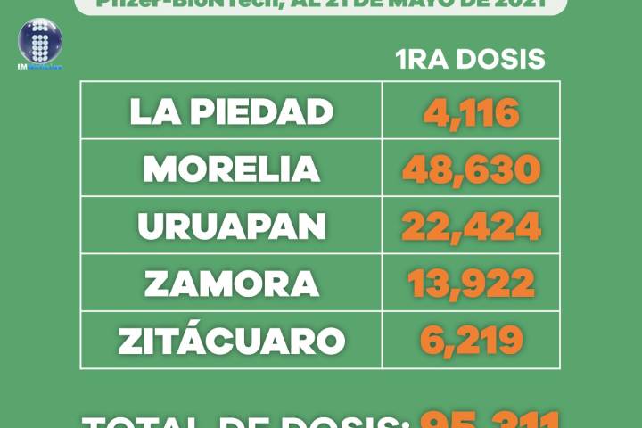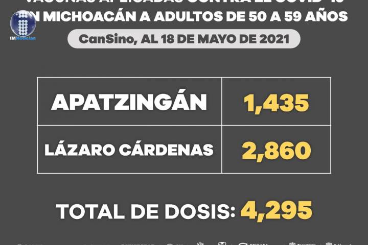 En Apatzingán (mil 435) y Lázaro Cárdenas (2 mil 860) se han aplicado 4 mil 295 dosis de CanSino, mientras que Morelia (10 mil 785), Uruapan (14 mil 125), Zamora (10 mil 375) y Zitácuaro (3 mil 101) suman 38 mil 386 dosis de Pfizer.