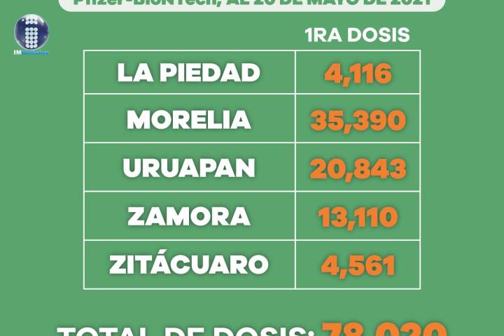 Las 78 mil 20 vacunas restantes son de la farmacéutica Pfizer, biológico aplicado a población de La Piedad, Morelia, Uruapan, ... Ver más...
