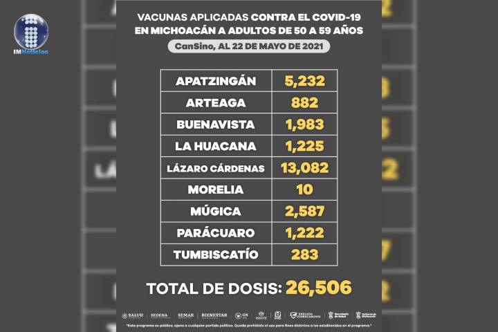 Del total de vacunas aplicadas 26 mil 506 pertenecen al biológico CanSino, aplicado en habitantes de las localidades de Apatzingán, Arteaga, Buenavista, La Huacana, Lázaro Cárdenas, Morelia, Múgica, Parácuaro y TumbiscatÃo.