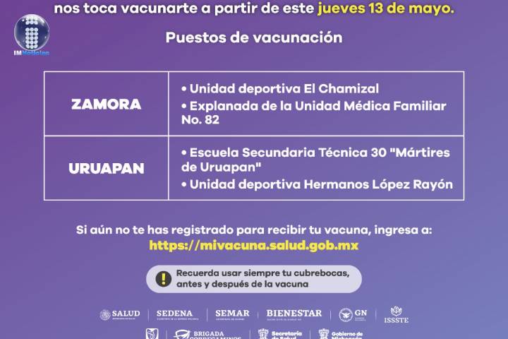 En Zamora los módulos de vacunación se encontrarán en la Unidad deportiva El Chamizal y en la explanada de la Unidad Médica Familiar No. 82.