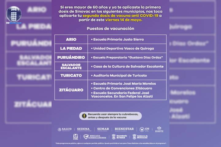 NOTICIAS 13/05/2021Este viernes, aplicación de segunda dosis de vacuna Sinovac en 6 municipios Este viernes 14 de mayo se aplicará la segunda dosis de la vacuna Sinovac contra COVID-19 a adultos mayores de 60 años, informó la Secretaría de Salud de Michoacán (SSM).