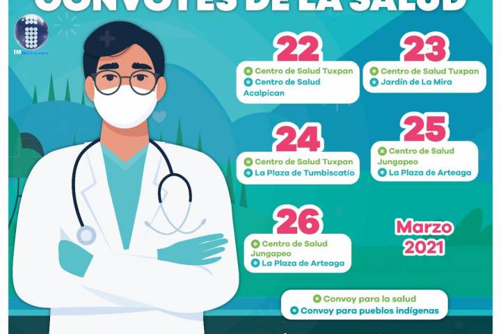 NOTICIAS 21/03/2021Recorrerán Convoyes de la Salud y de Pueblos IndÃgenas 5 municipiosDel 22 al 26 de marzo la SecretarÃa de Salud de Michoacán (SSM), desplegará los Convoyes de la Salud y de Pueblos IndÃgenas, para brindar servicios gratuitos a la población que asà lo requiera.