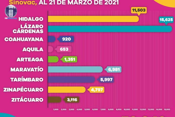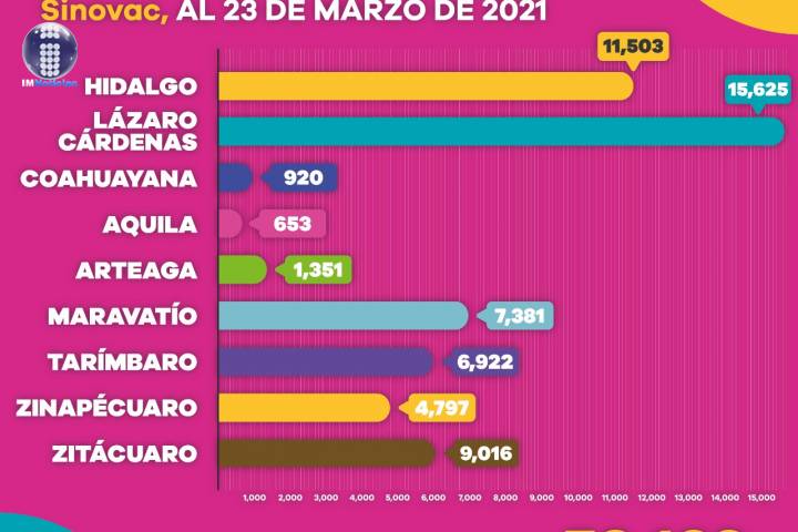 Dentro de la primera jornada de inmunización se han aplicado 184 mil 581 dosis para personas de 60 años en adelante, donde Huetamo, Jacona, Uruapan, Zamora, Ecuandureo, Ixtlán, Villamar, Aporo, Tingambato, Buenavista, Apatzingán, Parácuaro, Múgica, Angangueo, Coalcomán, Tepalcatepec, La Huacana, Aguililla, Chu... Ver más...