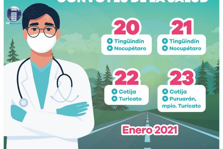 NOTICIAS 17/01/2021Convoyes de la Salud estarán en Tingüindín, Nocupétaro, Cotija y Turicato La Secretaría de Salud de Michoacán (SSM), informa a la población sobre los lugares en los que se encontrarán los Convoyes de Salud otorgando servicio gratuito, del 20 al 23 de enero.