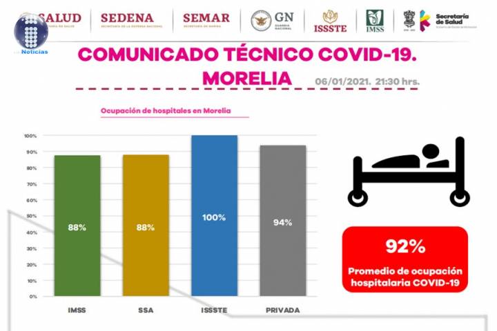 NOTICIAS 08/01/2021Registra Morelia 94% de ocupación hospitalaria COVID-19 La SecretarÃa de Salud de Michoacán (SSM), informa que la ocupación de camas para atención de pacientes con COVID-19 en Morelia llegó a un 94 por ciento.