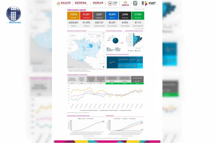 En la Unidad de Inteligencia Epidemiológica y Sanitaria (UIES) se han recibido un total de 73 mil 467 enfermos de vías respiratorias a descartar coronavirus, 40 mil 721 cumplieron con definición operacional resultando negativas a COVID-19, es decir, no tienen el virus. Hay 1 mil 927 sospechosos en diferentes municipios que se encuentran en proceso. Hasta el día de hoy se han acumulado 30 mil 819 casos confirmados (148 casos nuevos este ...