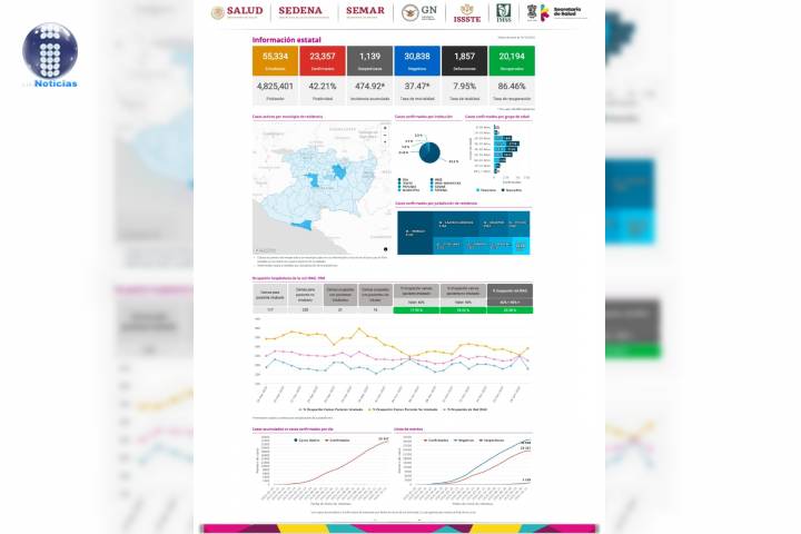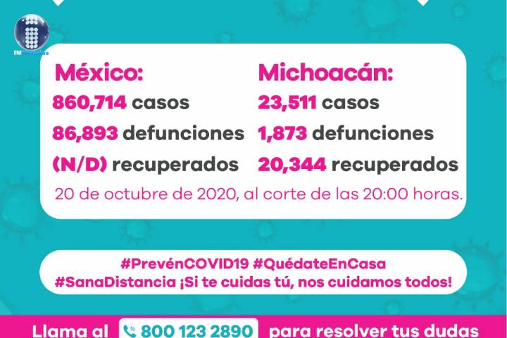 NOTICIAS 19/10/2020En Michoacán, 1857 fallecimientos por COVID-19En la Unidad de Inteligencia Epidemiológica y Sanitaria (UIES), se han recibido un total de 55 mil 334 notificaciones de enfermos de vías respiratorias a descartar coronavirus, 30 mil 838 cumplieron con definición operacional resultando negativas a COVID-19, es decir, no tienen el virus.