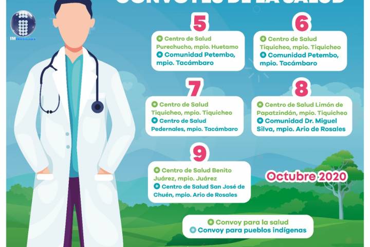 El convoy de la salud estará el 5 de octubre en el centro de salud Purechucho, municipio de Huetamo; 6 y 7 en el centro de salud de Tiquicheo, 8 en e... Ver más...