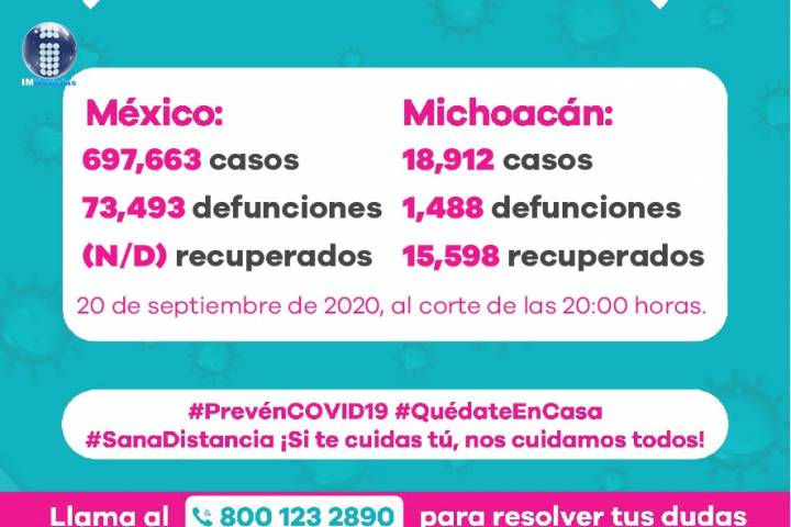 NOTICIAS 20/09/20201488 defunciones en Michoacán por COVID-19En la Unidad de Inteligencia Epidemiológica y Sanitaria (UIES), se han recibido un total de 46 mil 555 notificaciones de enfermos de vías respiratorias a descartar coronavirus, 25 mil 319 cumplieron con definición operacional resultando negativas a COVID-19, es decir, no tienen el virus.