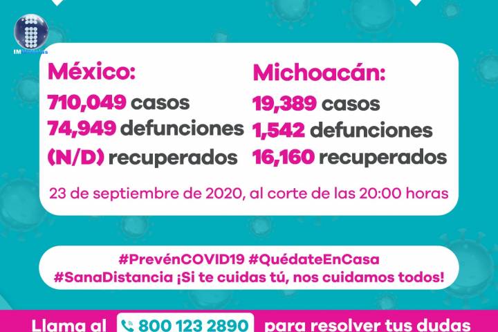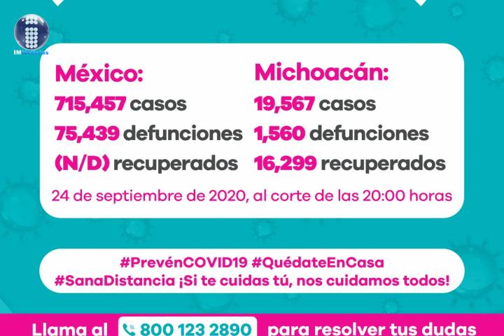 NOTICIAS 24/09/2020Ya son 1560 muertes por Covid-19 en Michoacán En la Unidad de Inteligencia Epidemiológica y Sanitaria (UIES), se han recibido un total de 47 mil 587 notificaciones de enfermos de vías respiratorias a descartar coronavirus, 26 mil 60 cumplieron con definición operacional resultando negativas a COVID-19, es decir, no tienen el virus.