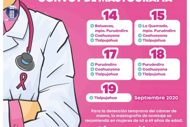 Como parte de las acciones para la detección temprana del cáncer de mama, los mastógrafos móviles de la Secretaría de Salud de Michoacán (SSM), estarán en los municipios de Puruándiro, Coahuayana y Tlalpujahua. El servicio gratuito para las mujeres de 40 a 69 años, se estará brindado del 14 al 18 de septiembre en Coahuayana y del 14 al 19 en Tlalpujahua. Para lo anterior deberán presentar credencial de elector y/o CURP, axilas ...