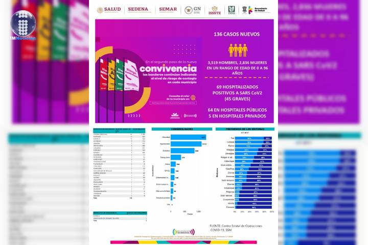 Hasta el día de hoy se han acumulado 6 mil 355 casos confirmados (136 casos nuevos) y 493 defunciones de pacientes po... Ver más...