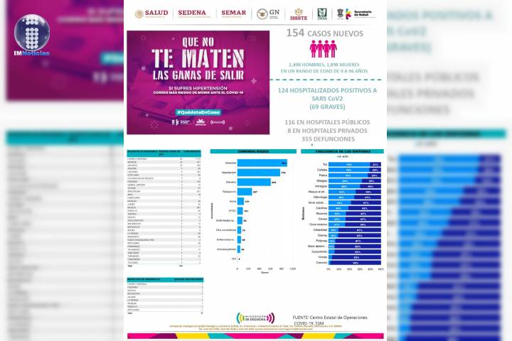 Hasta el día de hoy se han acumulado 4 mil 396 casos confirmados (154 casos nuevos) y 355 defunciones de pacientes positiv... Ver más...