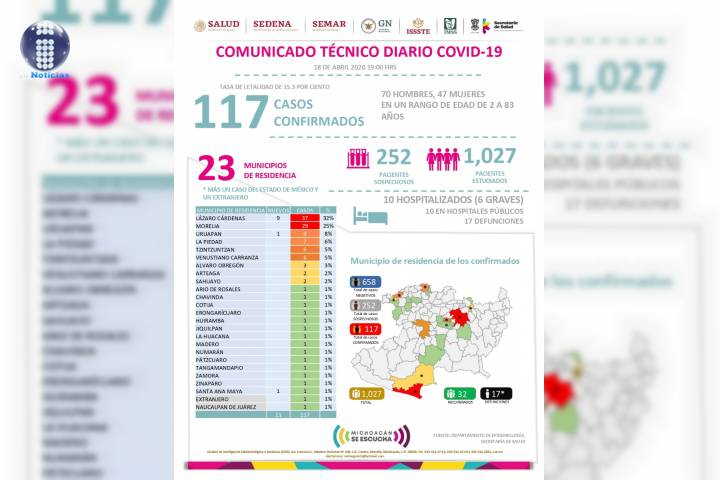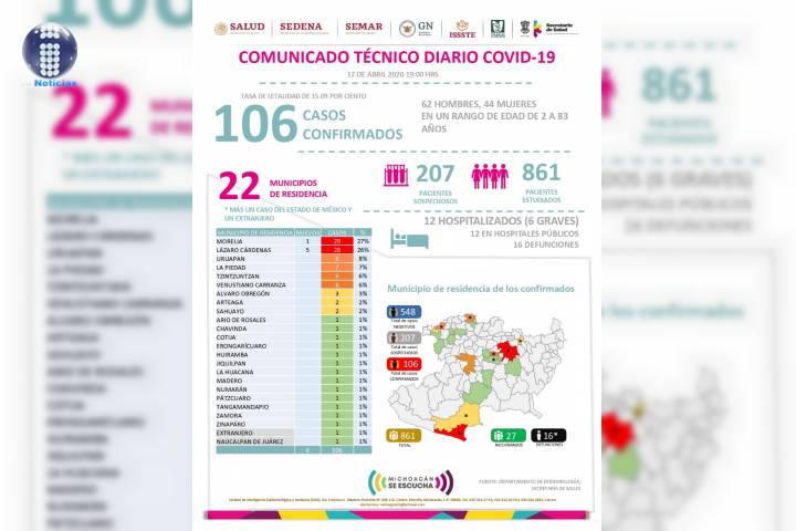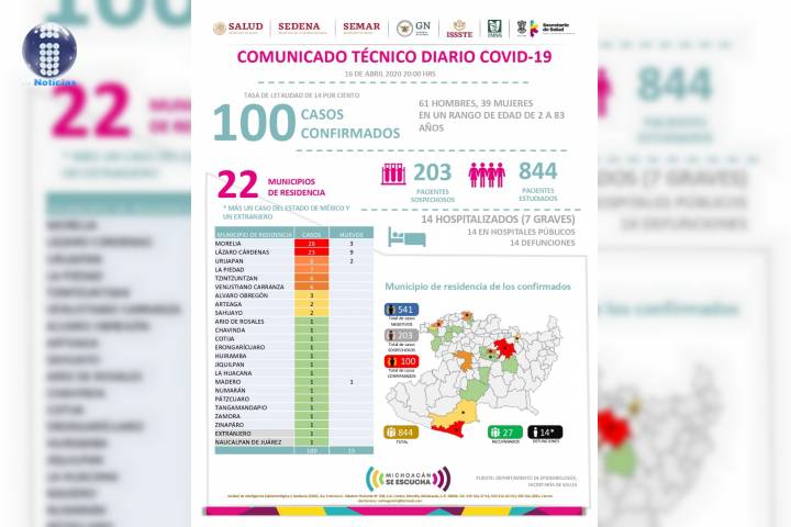 NOTICIAS 16/04/2020Ya son 14 muertes por Covid-19 en Michoacán 85 casos confirmados