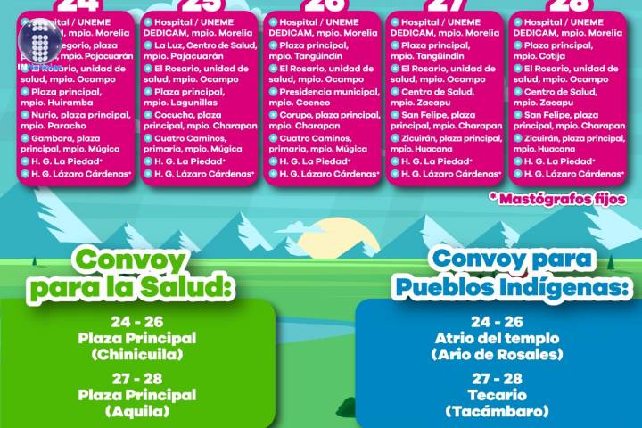 Del 24 al 28 de febrero, la unidad móvil de Pueblos Indígenas, estará en el atrio del templo en Ario de Rosales (24-26) y en Tecario, municipio de Tacámbaro (27-28). El convoy de la salud en las plazas principales de ... Ver más...