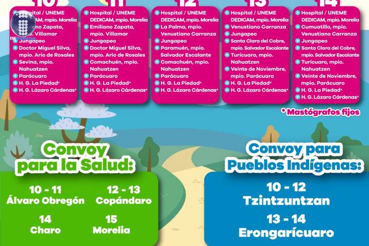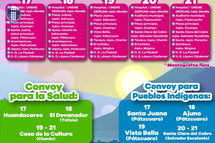 La unidad móvil de Pueblos Indígenas, estará en Tzintzuntzan (10-12) y Erongarícuaro (13-14), mientras que la de Salud en Álvaro Obregón (10-11), Copándaro (12-13), Charo (14) y Morelia (15).