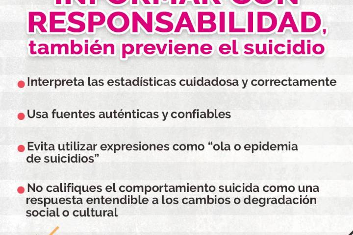NOTICIAS 29/04/2019Medios de comunicación, primordiales en la prevención del suicidio El suicidio es un grave problema de salud pública -a nivel mundial- que exige la atención de todos para su prevención, por ello la Coordinación General de Comunicación Social, por medio de su titular Julieta López Bautista, exhorta a los medios de comunicación para que a través de su labor diaria, contribuyan para que este tipo de acciones disminuyan cada día, no sólo en el estado sino a nivel nacional.