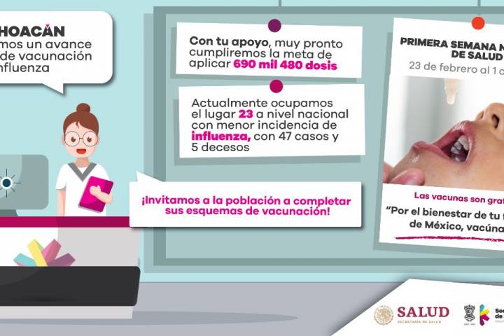 NOTICIAS 20/02/2019Registra SSM 84% de vacunación contra influenzaLa Secretaría de Salud de Michoacán (SSM), registra un avance del 84 por ciento en la vacunación contra la influenza, lo que significa que más de medio millón de michoacanos han sido protegidos contra este padecimiento.