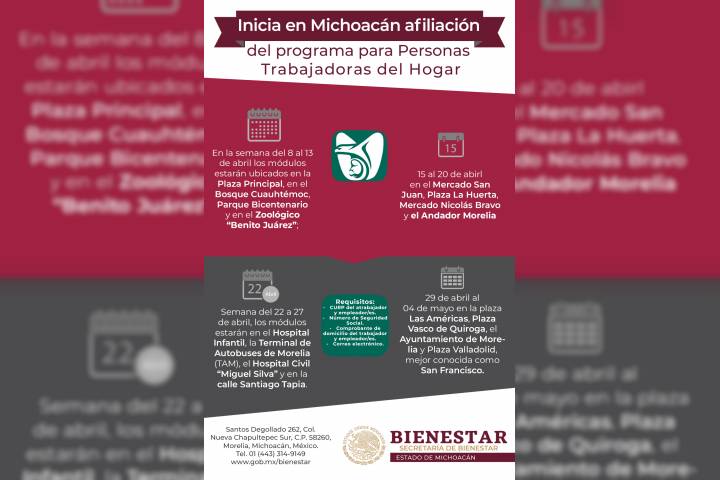 NOTICIAS 08/04/2019Inicia en Michoacán afiliación del programa para Personas Trabajadoras del HogarLa Secretaría del Trabajo y Previsión Social (STPS) inició la afiliación en módulos del programa piloto Incorporación de las Personas Trabajadoras del Hogar en Michoacán, con la finalidad de dignificar el trabajo doméstico remunerado e incrementar la calidad de vida de los beneficiarios.