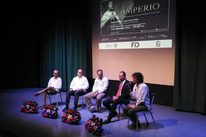 El Director de Prestaciones Económicas y Sociales del Seguro Social, Santiago de María Campos Meade, junto con el Delegado en Campeche, Álvaro Emilio Arceo Ortiz; el escritor Héctor Zagal, y el protagonista de la obra, el ac... Ver más...