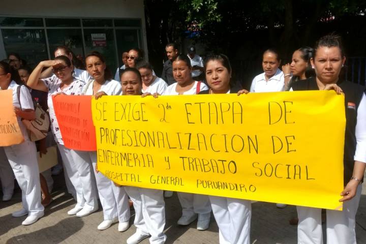 Para exigir la continuidad del Programa Estatal de Profesionalización de Enfermeras en una segunda convocatoria, personal de esta área adscrito a la Secretaría de Salud se manifestó en el patio principal del Hospital Civil "Dr. Miguel Silva".