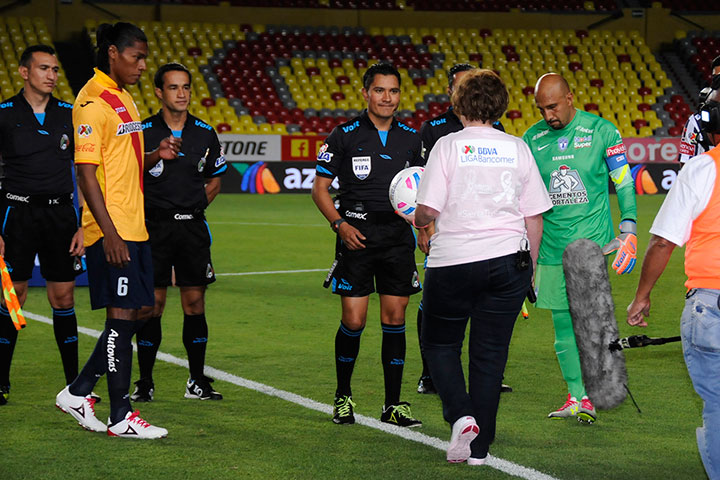 El Club Monarcas Morelia se sumó a las acciones en el marco del mes de lucha contra el cáncer en las mujeres, por lo que la presidenta del Sistema para el Desarrollo Integral de la Familia (DIF) Michoacán, Catherine R. Ettinger Mc Enulty, hizo entrega del balón al árbitro durante el inicio del partido Monarcas contra Pachuca, correspondiente a la Jornada 11.