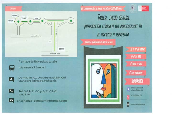 Los días 16 y 17 de mayo se llevará a cabo en el Centro Michoacano de Salud Mental (CEMISAM) el Taller de Salud Sexual denominado "Intervención Clínica y sus Implicaciones en el Paciente y Terapeuta", el cual está dirigido al personal del área de la Salud y el cual se efectuará en las propias instalaciones de la dependencia. Los participantes al evento tendrán la oportunidad de conocer más a fondo de temas como: Salud Sexual y Persp...