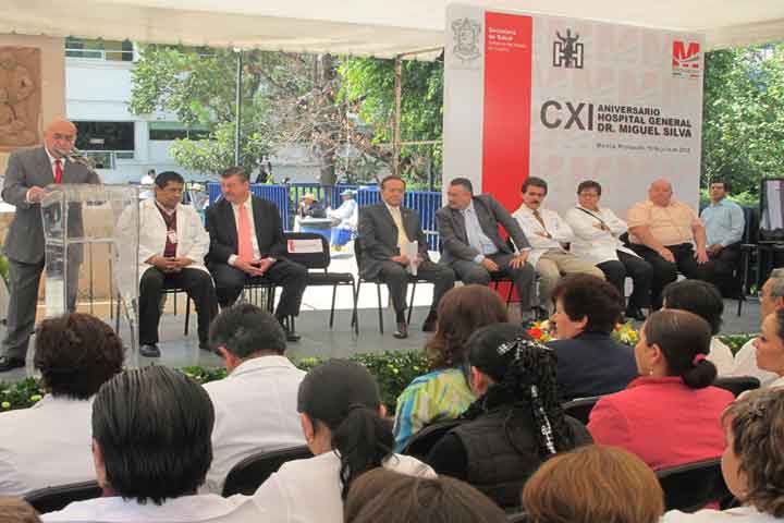 Mejorar el abasto de insumos y el equipamiento; así como seguir impulsando el fortalecimiento de los servicios de salud en el estado, es una prioridad del gobierno que encabeza Fausto Vallejo Figueroa, puntualizó, Benjamín Muñoz González, representante del secretario de Salud, Rafael Díaz Rodríguez, durante el acto protocolario del CXI Aniversario del Hospital General "Dr. Miguel Silva".